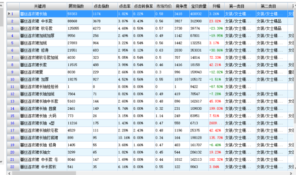 这是我用蕾丝连衣裙拓展出来的关键词,这些关键词乍看上去都是一模一样的关键词,但是如果我们认真去看一下,实际上这些词的排列组合都是不同的,而且他们的竞争度都是不一样的